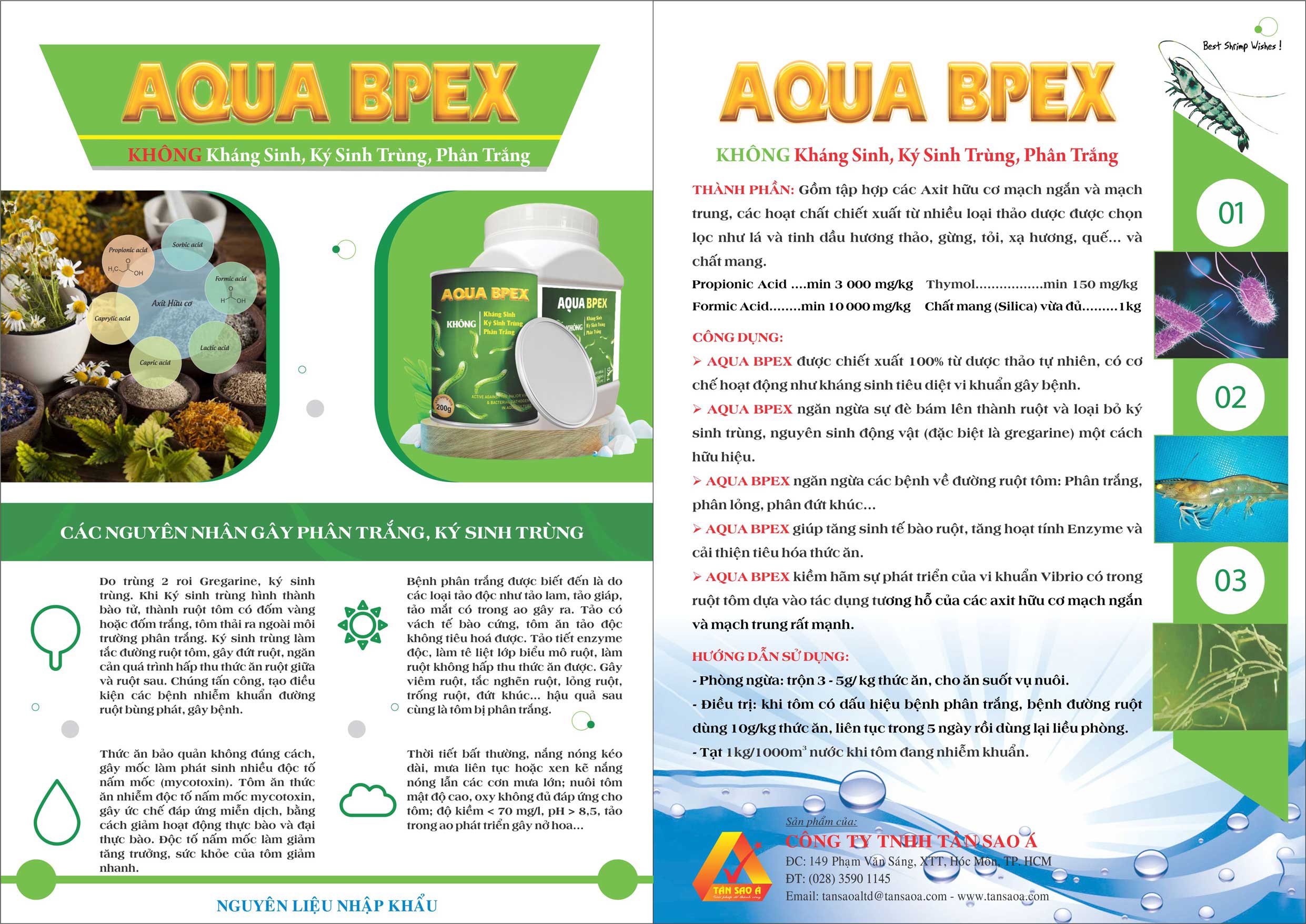 - AQUA BPEX giúp hỗ trợ kiềm hãm sự phát triển của vi khuẩn Vibrio có trong ruột tôm dựa vào tác dụng tương hỗ của các axit hữu cơ mạch ngắn và mạch trung rất mạnh.