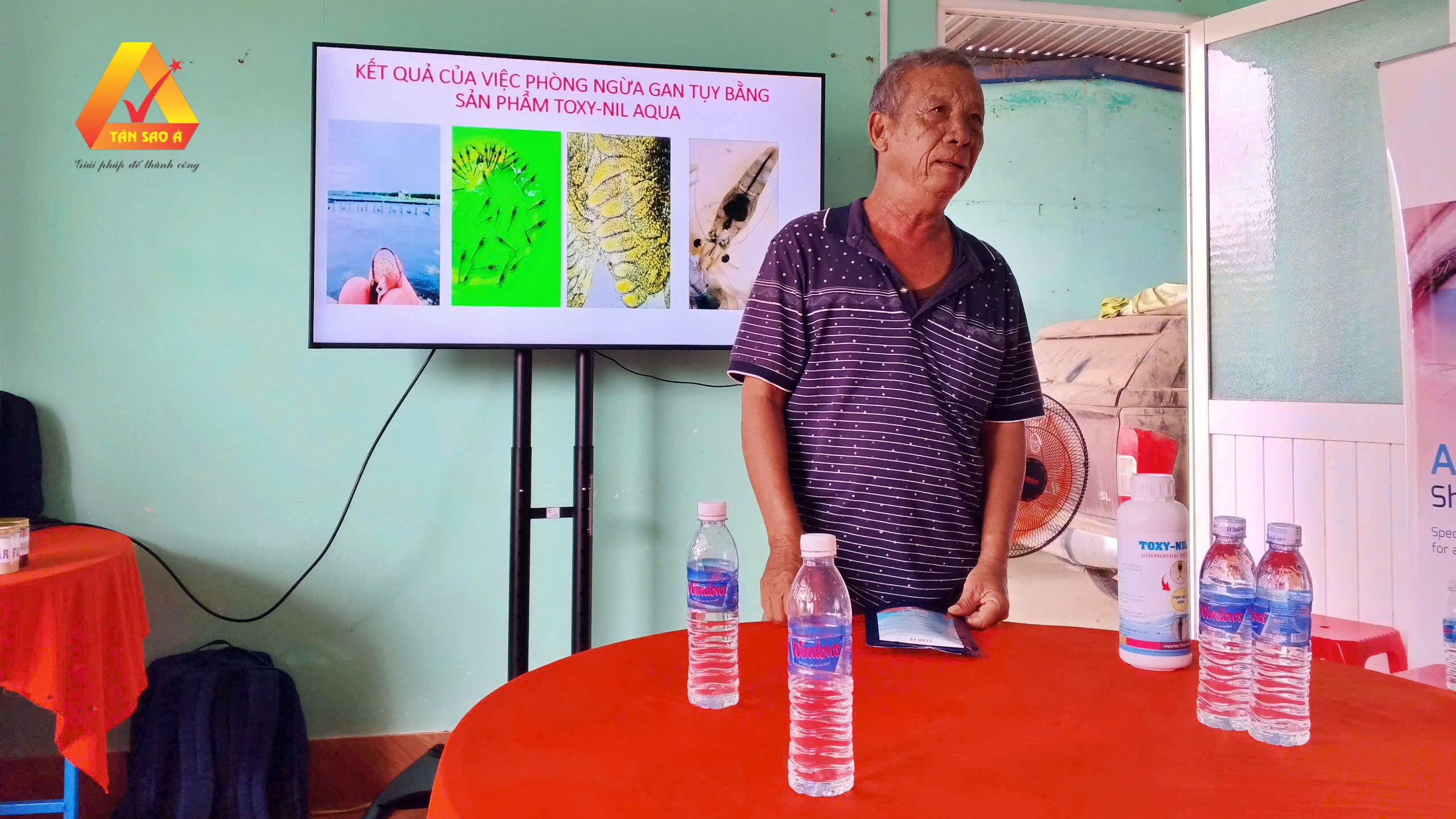 Cuối cùng, chú Ba, chủ đại lý Ba Tòng tại Đồng Tháp, đã chia sẻ kinh nghiệm thực tiễn trong việc áp dụng sản phẩm STAR FE và Toxynil-Aqua. Chú nhấn mạnh tầm quan trọng của việc lựa chọn sản phẩm phù hợp với điều kiện nuôi và khẳng định rằng các sản phẩm của Công ty Tân Sao Á đã giúp cải thiện đáng kể năng suất và chất lượng tôm của đại lý và bà con trong khu vực suốt nhiều năm liền.