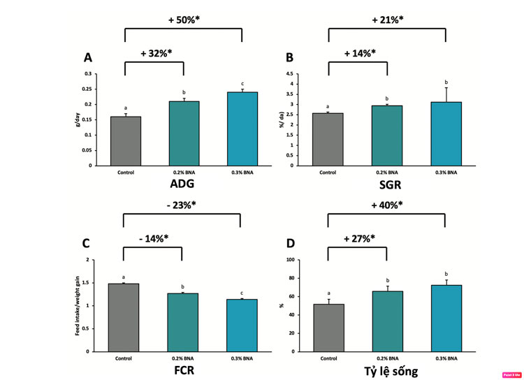 Sau 60 ngày cho ăn, kết quả cho thấy Bacti-Nil®Aqua cải thiện đáng kể tỷ lệ sống và tăng trưởng của tôm. Với lượng bổ sung 0,2% và 0,3% Bacti-Nil®Aqua, tỷ lệ sống tăng lần lượt 65,2% và 72,5%, tăng trưởng trung bình hàng ngày (ADG) tăng 32% và 50% (Hình 1), tốc độ tăng trưởng riêng (SGR) tăng 14% và 21% và FCR cải thiện lần lượt 14% và 23%.